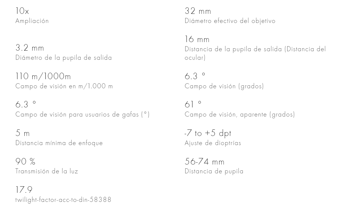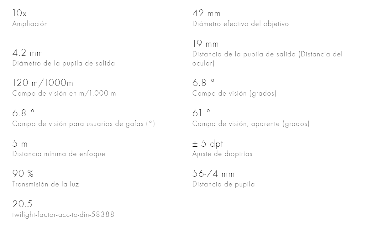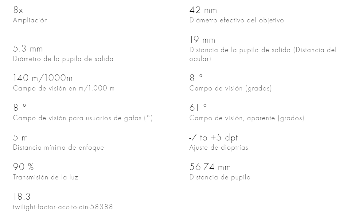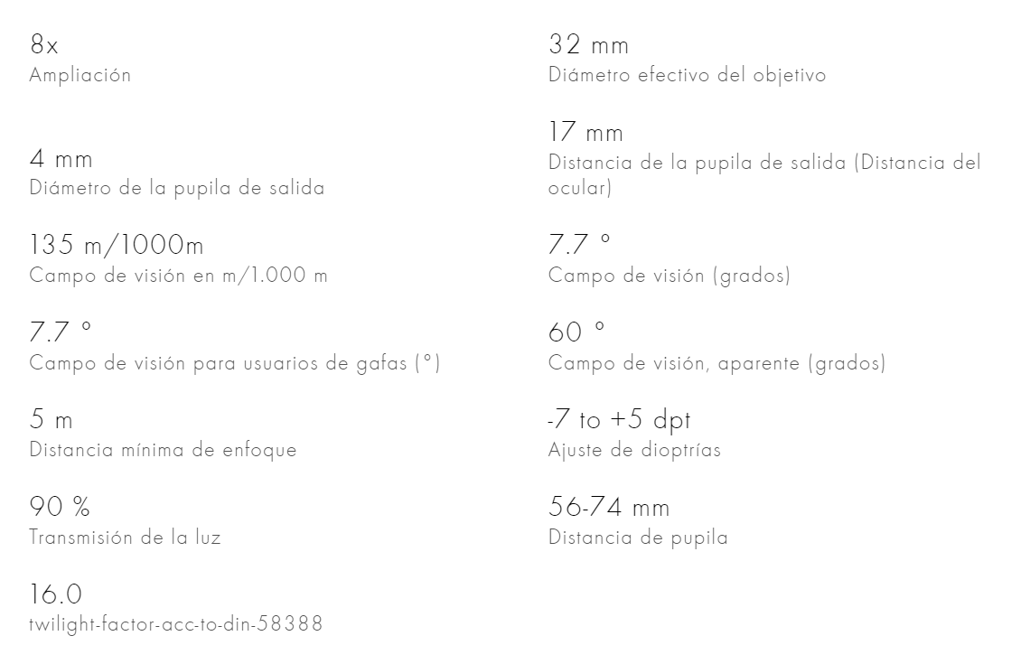 | Presentación | EL Range 8×32, EL Range 8×42, EL Range 10×32, EL Range 10×42 |